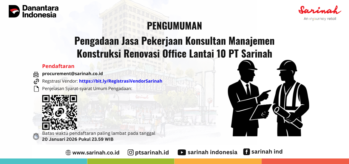 Jika berminat dapat mengirimkan surat pernyataan dengan judul “Surat Pernyataan Minat Umum Pengadaan Jasa Pekerjaan Konsultan Manajemen Konstruksi Renovasi Office Lantai 10” ke procurement@sarinah.co.id paling lambat pada 20 Januari 2026 pukul 23.59.