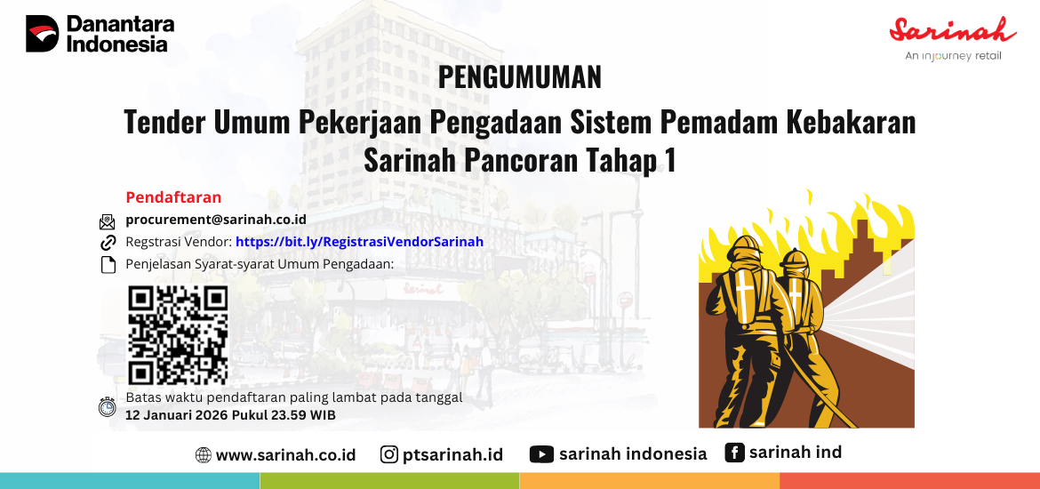 Jika berminat dapat mengirimkan surat pernyataan dengan judul “Surat Pernyataan Minat Mengikuti Pekerjaan Pengadaan Sistem Pemadam Kebakaran Sarinah Pancoran Tahap 1” ke procurement@sarinah.co.id paling lambat pada 12 Januari 2026 pukul 23.59.