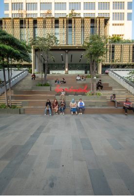 Letak yang strategis di area depan gedung samping Anjungan Sarinah, menghadirkan konsep ruang terbuka yang lapang. Menghadap langsung ke hiruk-pikuk Jalan M.H. Thamrin, tersedia beragam spot bersantai yang sangat strategis untuk dinikmati pengunjung | 2025