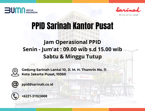 Alamat PPID PT Sarinah Jl. MH THAMRIN 11 Telp : (021) 31923008 Email: ppid@sarinah.co.id