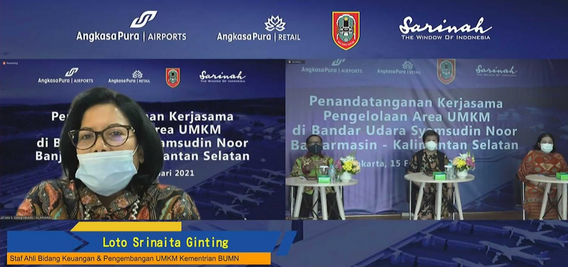 Jakarta, 15 Februari 2021 - PT Angkasa Pura Retail, salah satu anak perusahaan PT Angkasa Pura I (Persero), menandatangani perjanjian kerja sama dengan PT Sarinah (Persero) dan Dinas Koperasi dan Usaha Kecil Menengah (UKM) Provinsi Kalimantan Selatan dalam rangka mendukung pengembangan dan pemasaran produk UMKM Kalimantan Selatan di Bandara Syamsudin Noor Banjarmasin.
