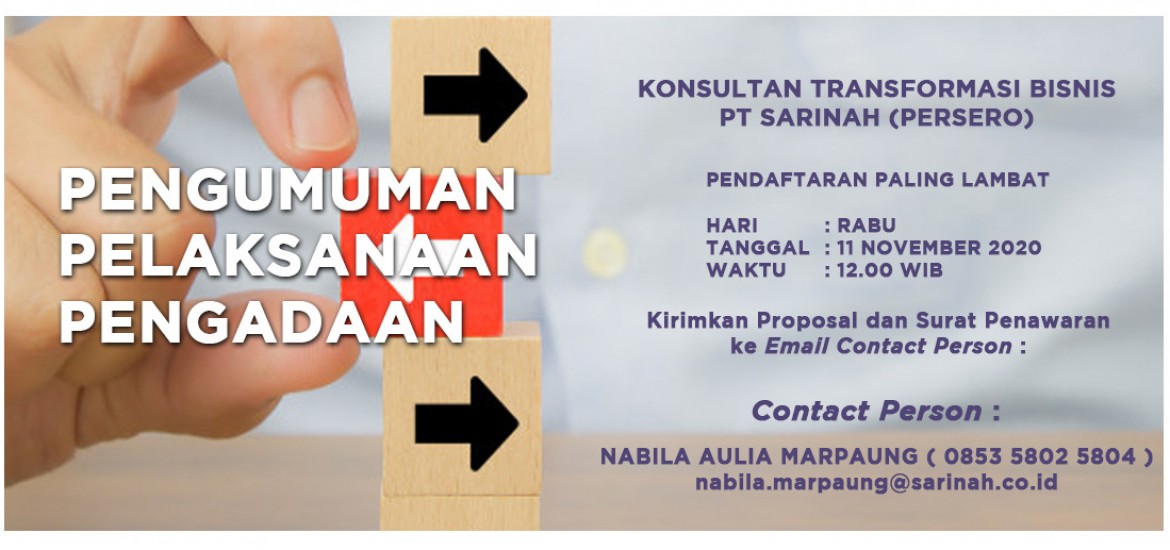 Sebagai bagian Transformasi Sarinah kembali ke khitahnya untuk menjadi Rumah bagi UMKM Indonesia Diberitahukan bahwa PT Sarinah (Persero) akan menyelenggarakan Pengadaan Konsultan Transformasi Bisnis