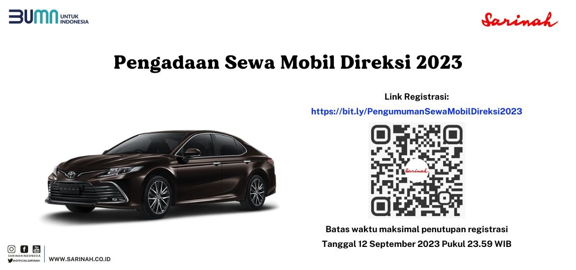 1. Jika berminat dapat mengirimkan surat pernyataan dengan judul “Surat Pernyataan Minat Mengikuti Pengadaan Sewa Mobil Direksi 2023” ke procurement@sarinah.co.id paling lambat pada 12 September 2023 pukul 23.59.