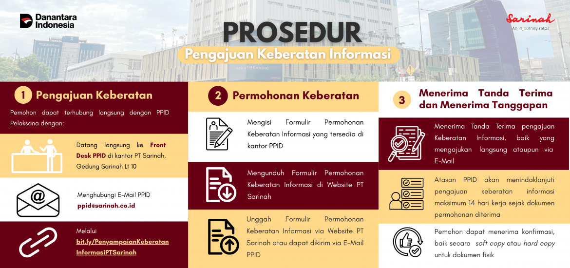Apabila terdapat keberatan terkait layanan informasi publik yang diberikan, masyarakat berhak mengajukan keberatan sesuai dengan ketentuan yang berlaku. Untuk menyampaikan keberatan informasi, berikut adalah prosedur yang sudah tersedia sebagaimana ketentuan oleh PT Sarinah.