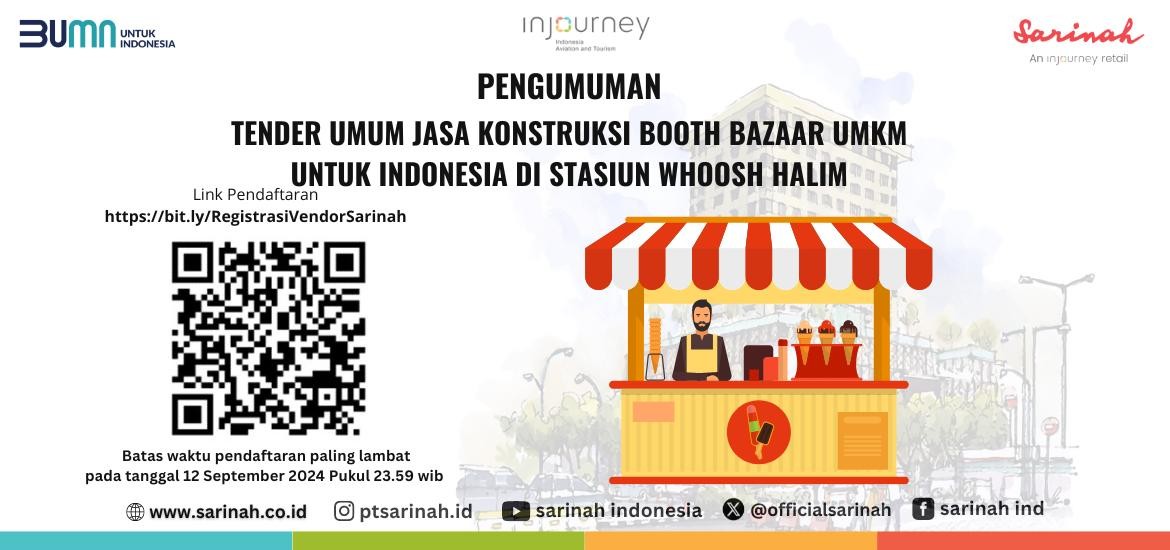 Jika berminat dapat mengirimkan surat pernyataan dengan judul “Surat Pernyataan Minat Mengikuti Jasa Konstruksi Booth Bazar UMKM Untuk Indonesia di Stasiun Whoosh Halim” ke procurement@sarinah.co.id paling lambat pada 12 September 2023 pukul 23.59.