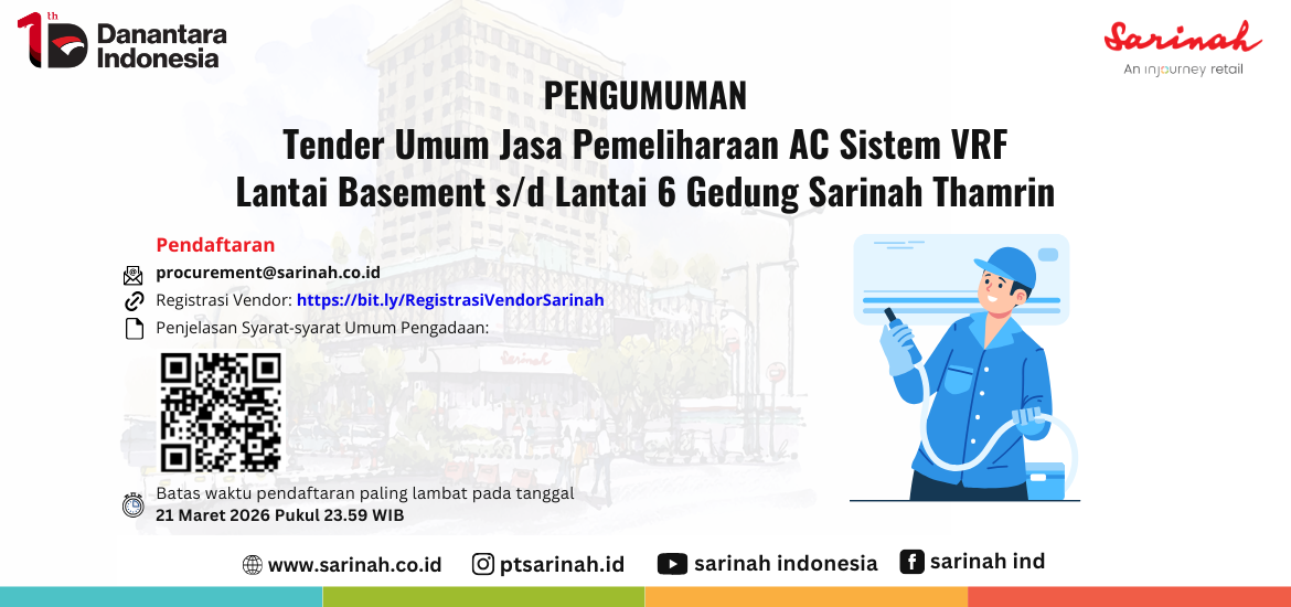 1. Jika berminat dapat mengirimkan surat pernyataan dengan judul “Surat Pernyataan Minat Mengikuti Pemeliharaan AC Sistem VRF lantai Basement s/d Lantai 6” ke procurement@sarinah.co.id paling lambat pada 21 Maret 2026 pukul 23.59.