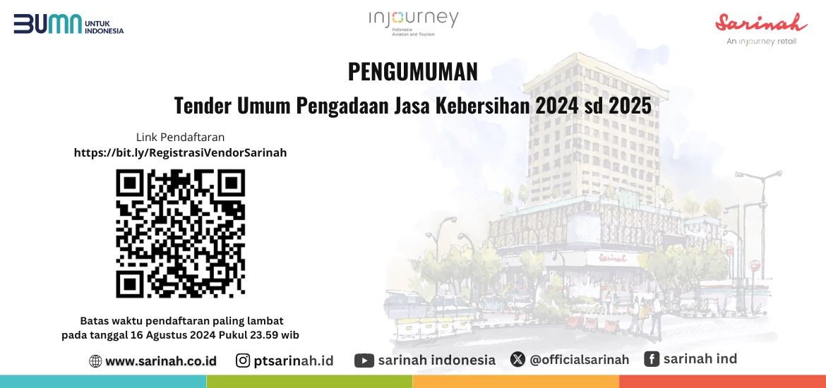 1. Jika Berminat dapat mengirimkan surat penyataan dengan judul “Surat Pernyataan Minat Mengikuti Pengadaan Jasa Kebersihan 2024 sd 2025” ke procurement@sarinah.co.id paling lambat pada tanggal 16 Agustus 2024 Pukul 23.59 dan mengirimkan kontak PIC Pengadaan ini