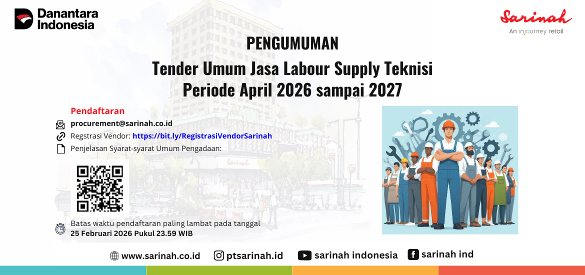 Jika berminat dapat mengirimkan surat pernyataan dengan judul "Surat Pernyataan Minat Mengikuti Tender Umum Pengadaan Jasa Labour Supply Teknisi Periode April 2026 sampai 2027" ke procurement@sarinah.co.id paling lambat pada 25 Februari 2026 pukul 23.59.